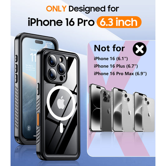 Temdan Magnetic for iPhone 16 Pro Case Waterproof,Built-in Screen Protector[IP68 Underwater][Upgrade Military Dropproof][Compatible with MagSafe] Full Body Shockproof for Phone Case 6.3'' - Black